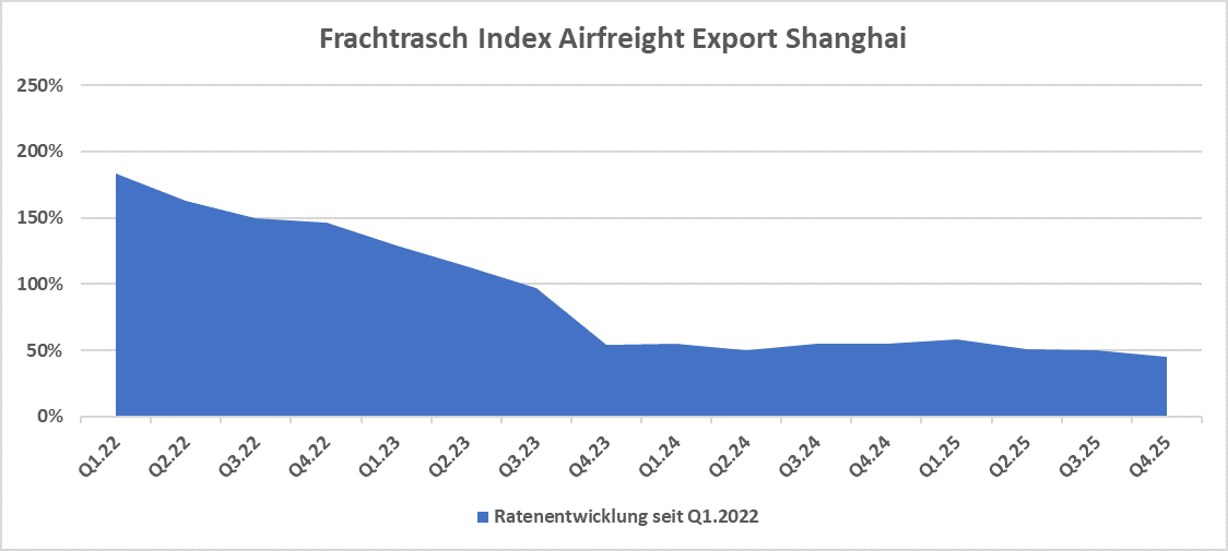 Das Ratenniveau aus China weist zu Beginn des Jahres eine Reduzierung im zweistelligen Prozentsatz aus. Reduzierte Kapazitäten (z.B. China Southern >75% reduzierte Flüge von und nach China) und das anstehende Chinese New Year (17.02. bis 03.03.2026) werden allerdings kurz- und mittelfristig wieder für ein steigendes Ratengefüge sorgen. Eine optimale Planung ist erforderlich, um noch aus- und eingehende Luftfrachten termingerecht vor CNY abzufertigen bzw. auszuliefern. Durch die angekündigten US-Zölle wird das Luftfrachtvolumen in die USA kurzfristig steigen, was am Markt schon spürbar ist mit ausgebuchten Frachtern und längeren Laufzeiten zu den US-Destinationen – aber die Konditionen sind weitestgehend unverändert zum Vorquartal. Das Export-Niveau Richtung Fernost ist etwas rückläufig im Vergleich zu den Vormonaten.
